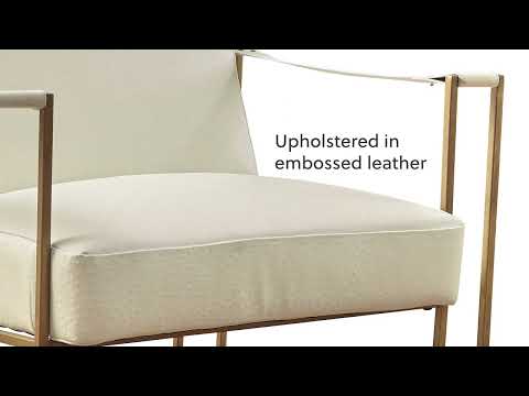 Less is so much more with this ultra-cool accent chair. A mastery in open-concept living, this chair with sturdy metal base is enriched with thickly padded box cushions wrapped in a cream leather with ostrich patterned embossing. Leather armrests are a strapping touch.